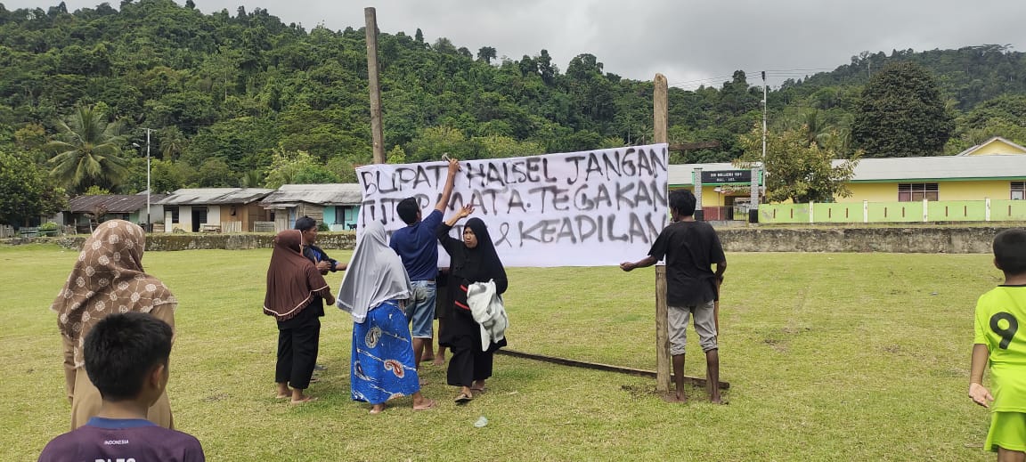 Sebagai bentuk protes, warga memasang spanduk di tengah lapangan sepak bola Saketa yang rencananya menjadi lokasi pusat pertandingan Bupati Cup 2025 untuk Zona Gane Barat dan dua kecamatan lain. Spanduk tersebut bertuliskan
