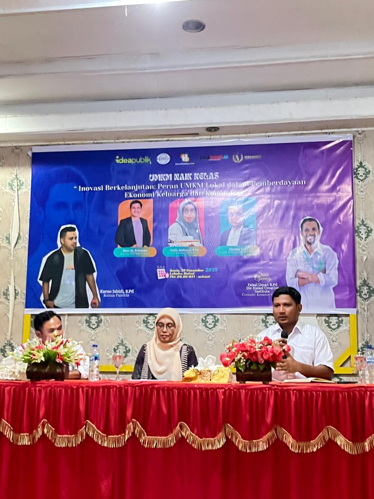 Labuha, Delangi.com – Halsel Creative Institute kembali menggelar kegiatan penguatan kapasitas pelaku usaha mikro, kecil, dan menengah (UMKM) bertajuk “Inovasi Berkelanjutan: Peran UMKM Lokal dalam Pemberdayaan Ekonomi Keluarga dan Komunitas”, yang berlangsung di Labuha, Kabupaten Halmahera Selatan, Senin (29/12/2025).